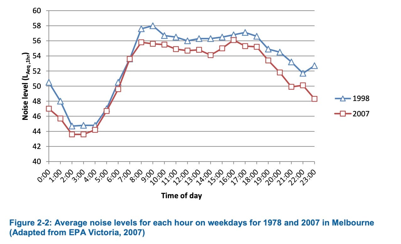 If we assume that inner-city ambient sound is typically 45dB using the Environmental Reference Standard Category II - Outdoor LAeq,8h from 10 p.m. to 6 a.m, plus 5dB for economic activity. Category II covers land uses such as Activity Centre, Commercial, Mixed-Use, and Industrial Zones, which are typical of live music venue locations in live music precincts. Other inner-city ambient sound measurements range from 52 to 55 dB (see references). If we subtract the internal noise floor of an apartment used in the noise protocol of 45 dB (s103 (b)), we can assume that the minimum level of building fabric sound attenuation is at least 5 dB without taking into account internal noise sources such as a fridge, air conditioner and mechanical ventilation. This seems low to me as its estimated that external building fabric can range from 30 to 60dB depending on construction type. Typically, single brick construction provides around 45db and double brick with a cavity provides 50dB. Such brick construction types are typical where live music precincts are likely to be located, and any residential developments constructed after the introduction of s53.06 of the Victorian Planning Provision would not be of lightweight construction (plasterboard, cladding and either timber or steel framing), which provides 30 – 40 dB attenuation.
