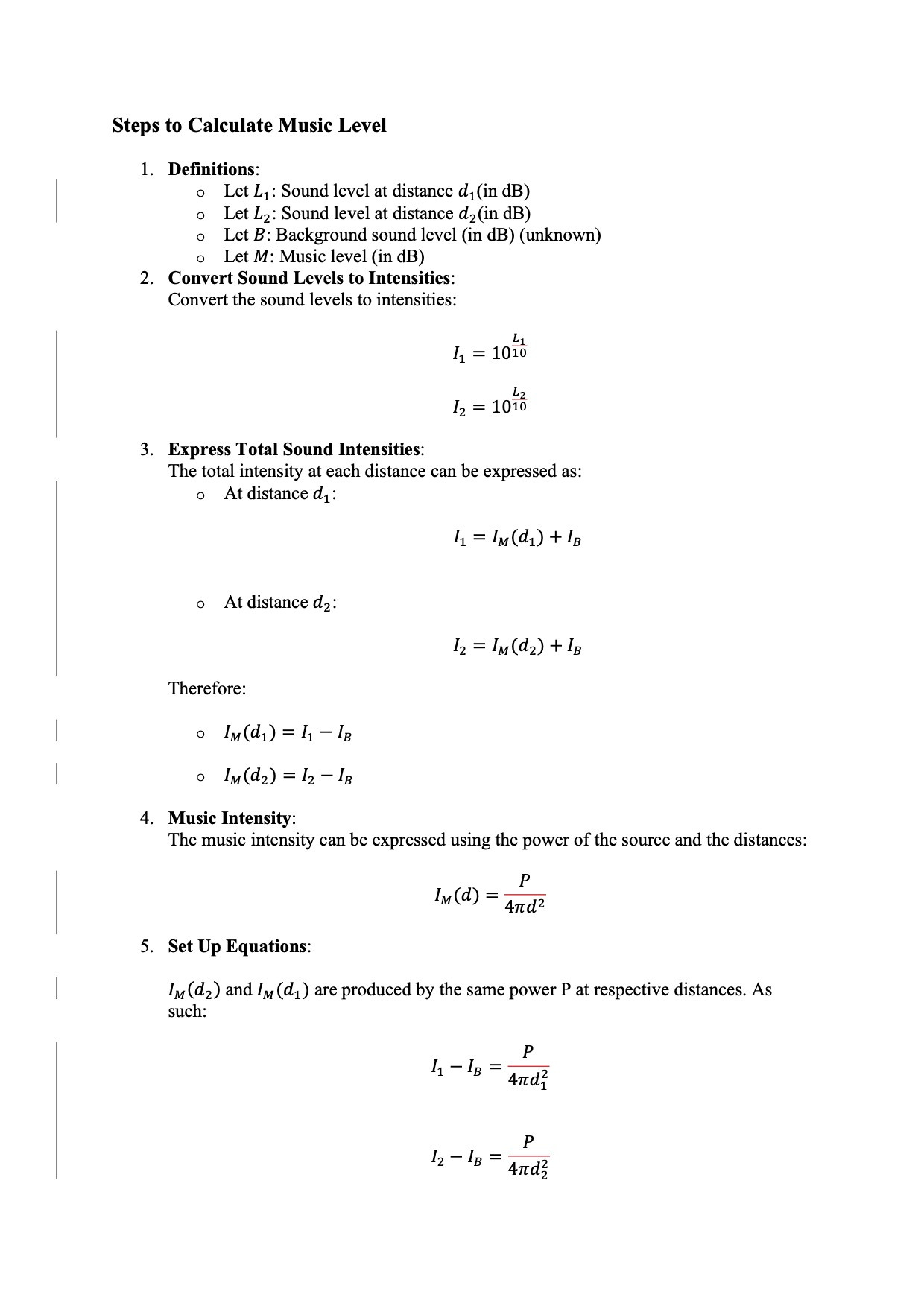 By following these steps, you can estimate the music level in dB based on the two sound readings at known distances, without needing to know the background sound level directly. The equations allow you to isolate the music level through the relationships between the measured intensities and distances.
